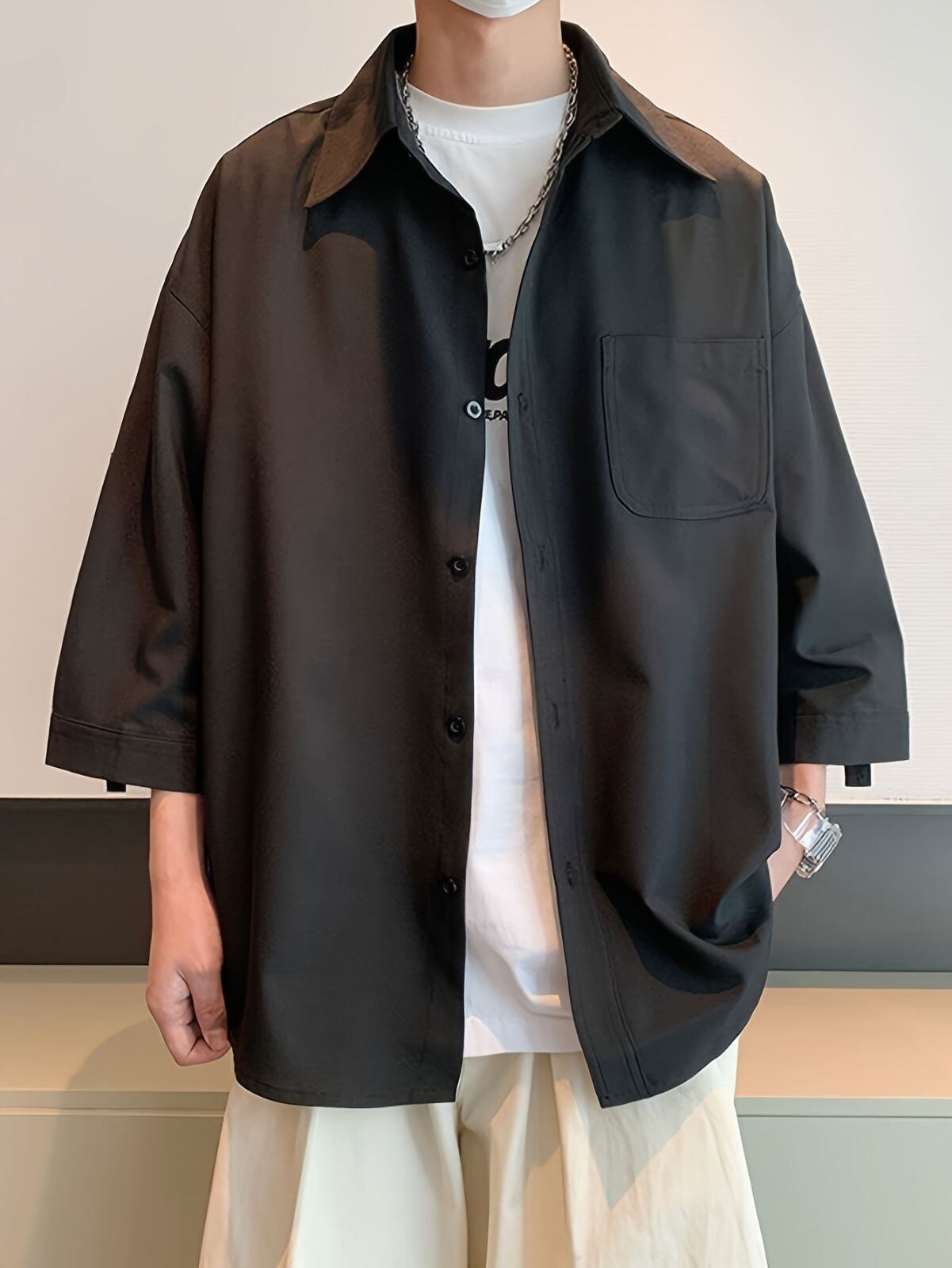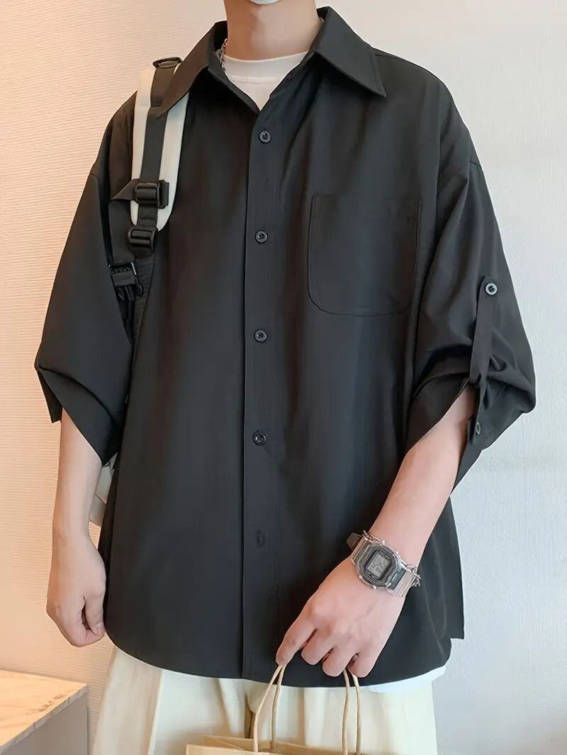 メンズ シャツ 春夏秋 無地 ブラック カジュアル ルーズフィット ボタンアップ 調整可能袖 3/4袖 軽量 ポリエステル カフスシャツ おしゃれ
