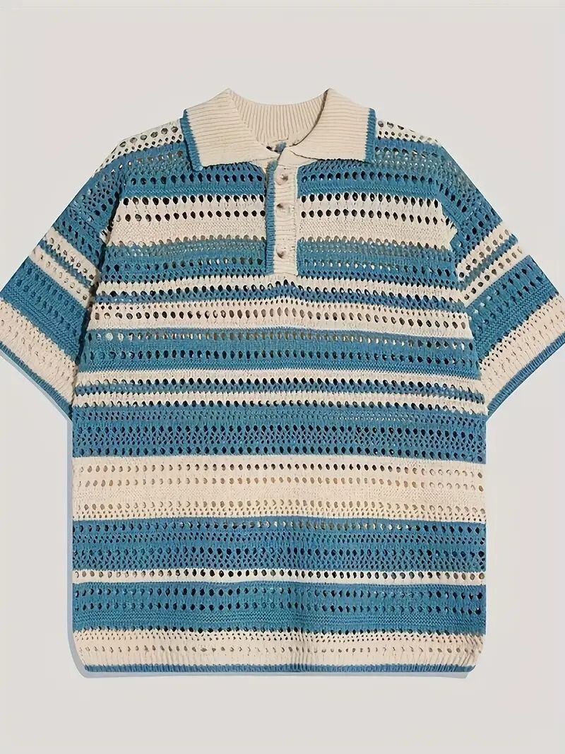 メンズ ビンテージ ストライプ ニットポロシャツ 半袖 春夏 軽量 通気性 ラウンドネック オープンワークデザイン カジュアル パーティー