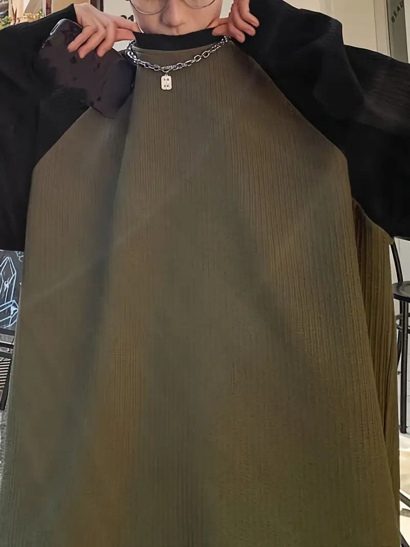 メンズ Tシャツ 長袖 オーバーサイズ クルーネック カラーブロック オリーブグリーン ブラック 春秋 カジュアル フォーマル