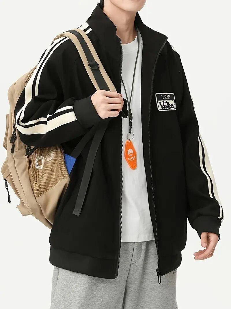 メンズ ジャケット 春秋 カジュアル スポーティー スタンドカラー ルーズフィット コントラストストライプ レターパッチ ジッパーフロント アーバンストリート