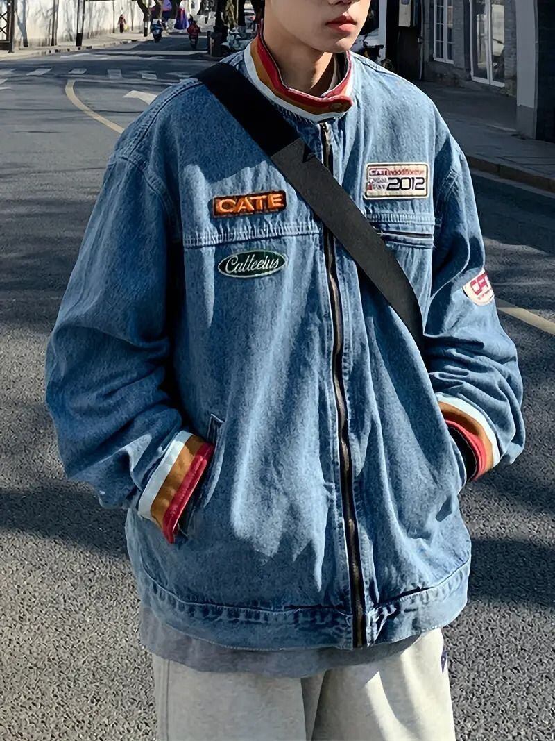 メンズ ジャケット ヴィンテージ風 モーターサイクル フェイクデニム風 スタンドカラー ジップアップ ルーズフィット カジュアル アウター バイカースタイル