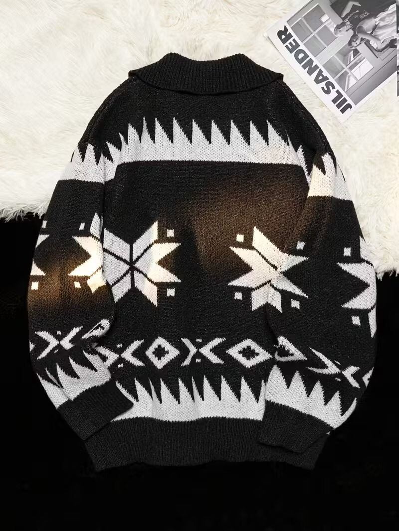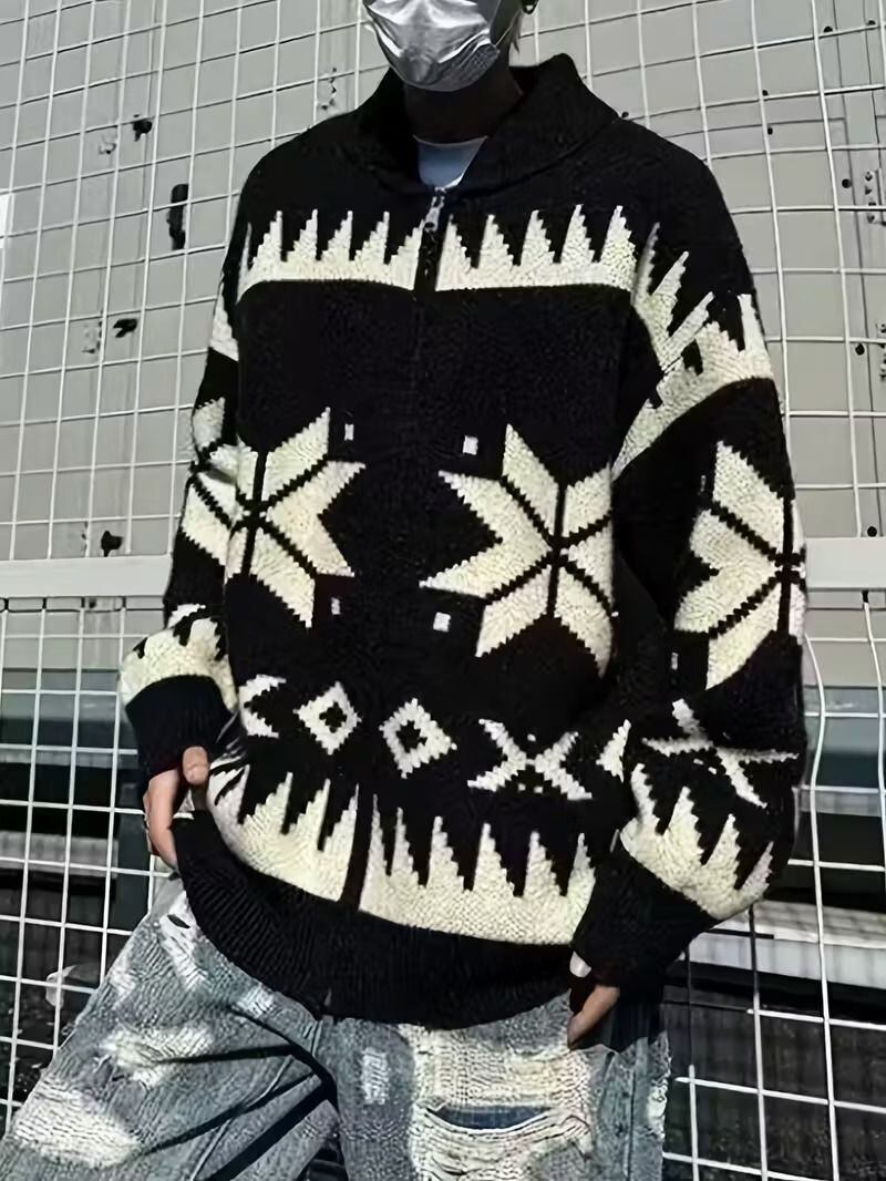 メンズ ニットセーター ジオメトリック柄 ブラック ホワイト カラーブロック ルーズフィット スタンドカラー カジュアル プルオーバー 秋冬 春 レイヤリング トップス