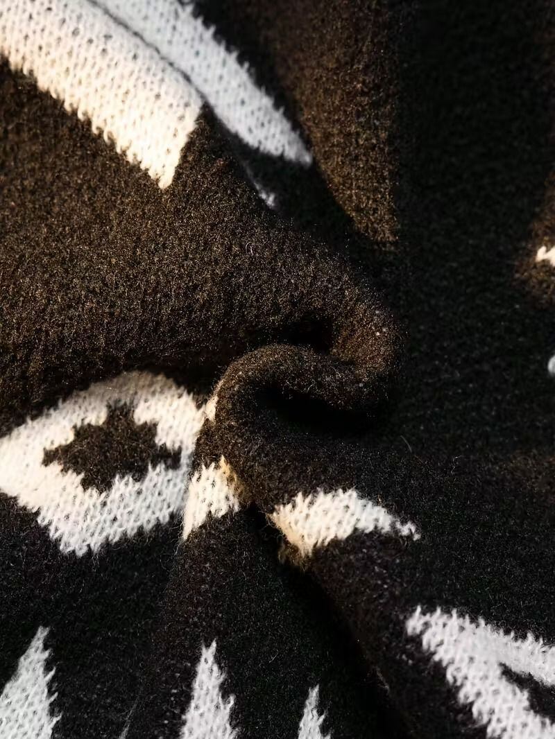 おしゃれな幾何学模様が特徴のルーズフィットニットセーターです。ブラックとホワイトのカラーブロックデザインが、洗練された印象を与えています。スタンドカラーで首元もおしゃれに決まり、カジュアルなコーディネートにぴったりのプルオーバーです。秋冬のレイヤリングにも、春先の軽やかな着こなしにも大活躍する一着です。着心地もゆったりとしており、リラックスした日常使いにも最適です。