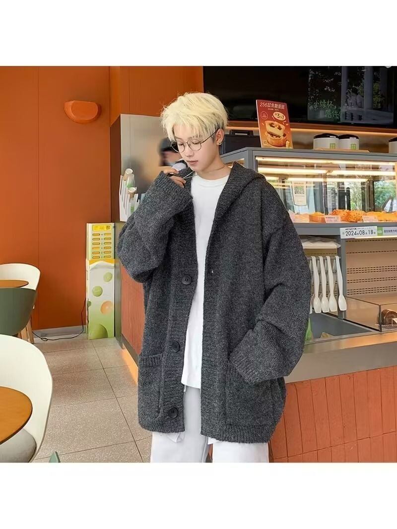 メンズ カーディガン フード付き オーバーサイズ ダークグレー 韓国ファッション ストリート 長袖 秋冬用 コート カジュアル レイヤード 暖かい 無地 パーカー感覚 防寒 トレンド