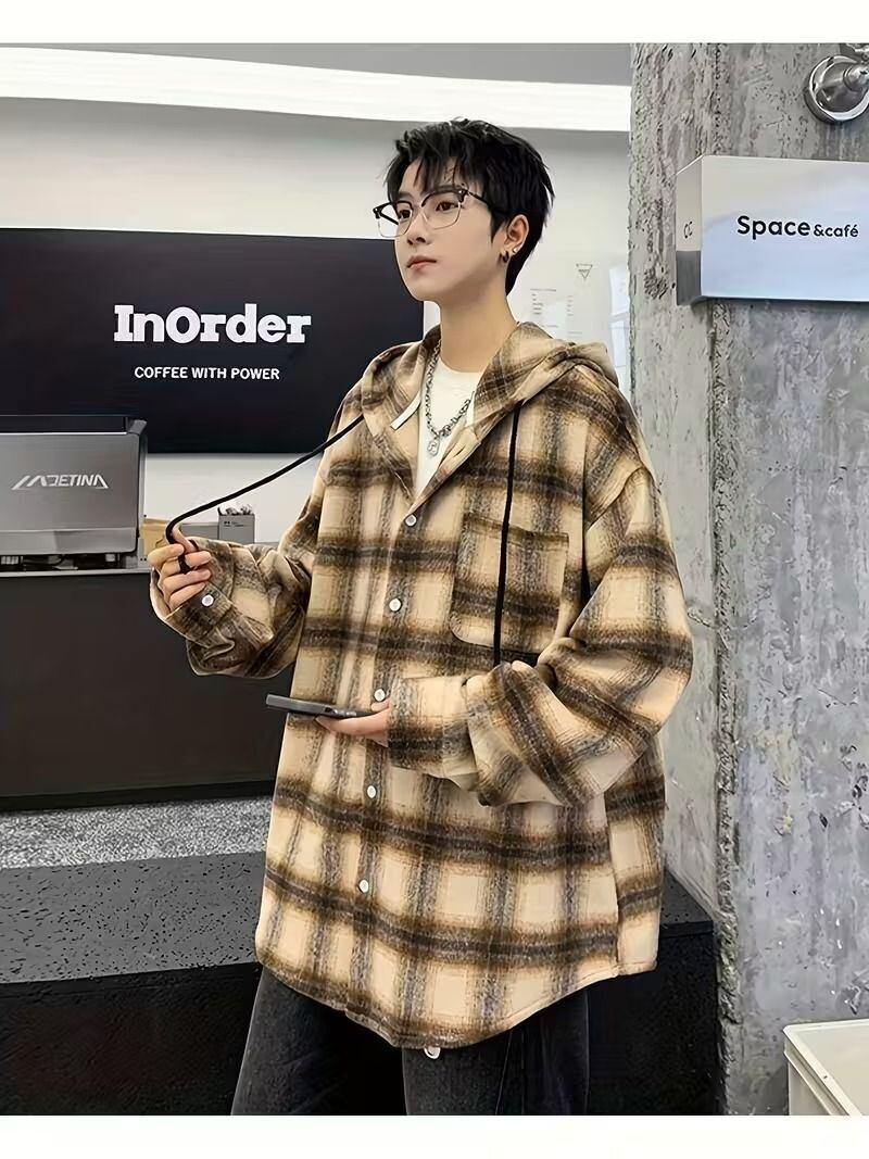メンズ シャツジャケット フード付き オーバーサイズ チェック柄 ブラック ホワイト ピンク ベージュ カジュアル 春秋用 レイヤリング ポケット付き アウター 韓国ファッション ストリート トレンド 防寒 おしゃれ