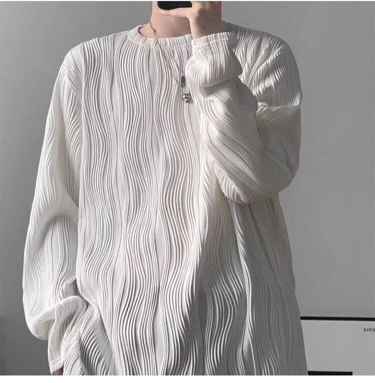 メンズ リラックスフィット 長袖Tシャツ ホワイト テクスチャード生地 ラウンドネック カジュアルルーズTシャツ 秋冬用 ミニマリストスタイル