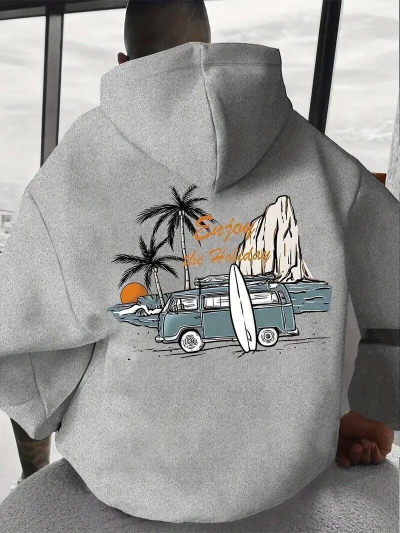 メンズ カリフォルニアサーフ グラフィック フーディー - 「Hang Loose」レトロプリント付き パームツリー柄 ルーズフィット プルオーバースウェット 長袖 カジュアルパーカー