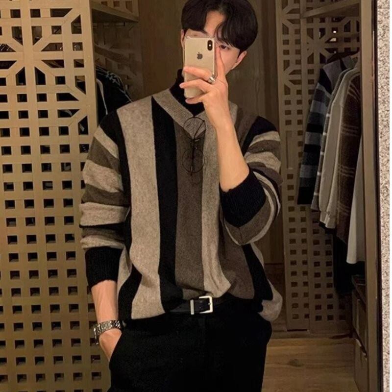 メンズ レトロ Vネック セーター カラーブロッキング ストライプデザイン ポケット付き ルーズフィット プルオーバー ブラック&グレー 春秋冬対応 カジュアルウェア