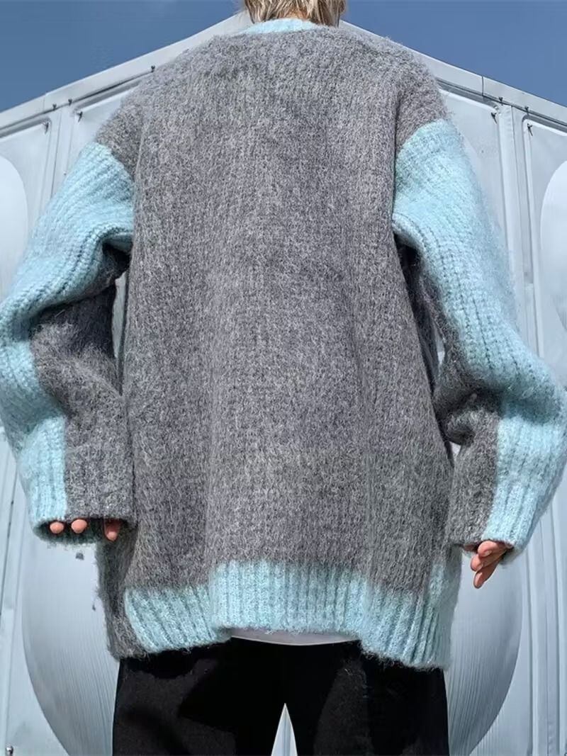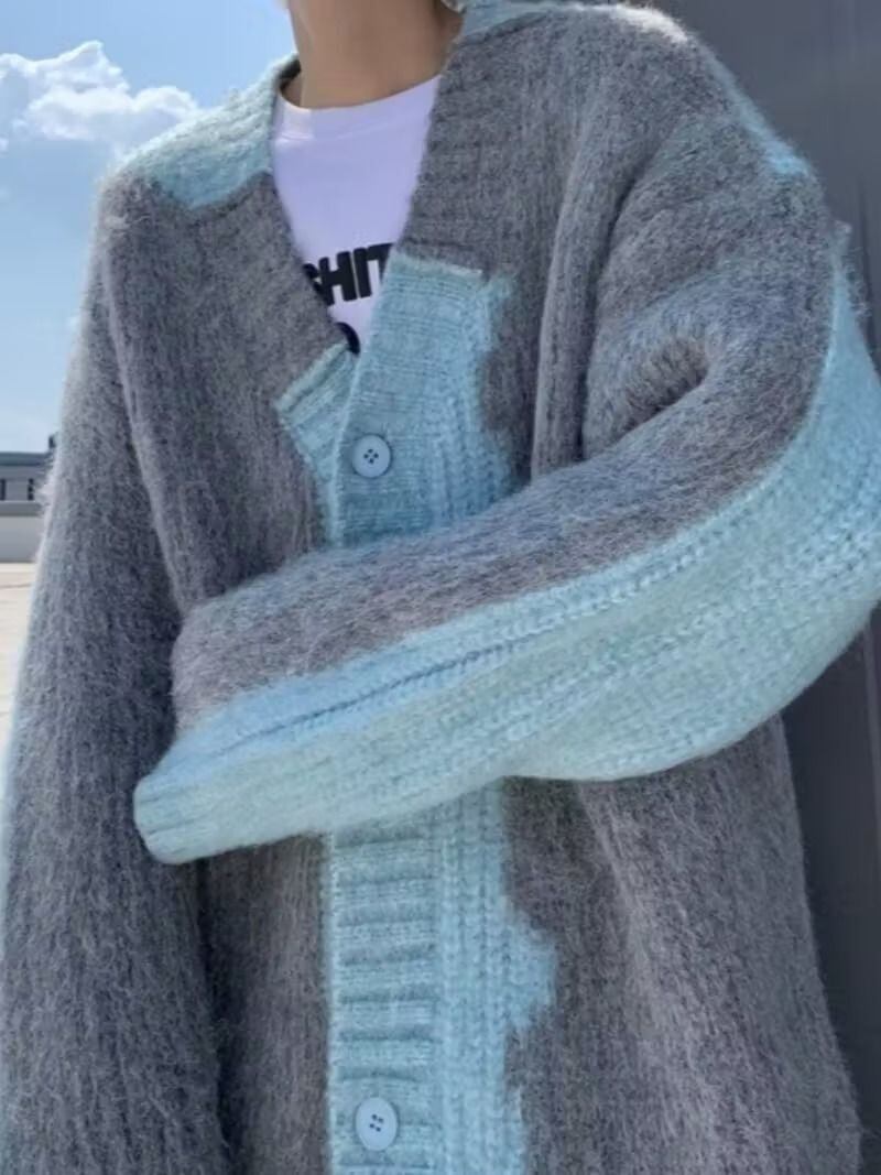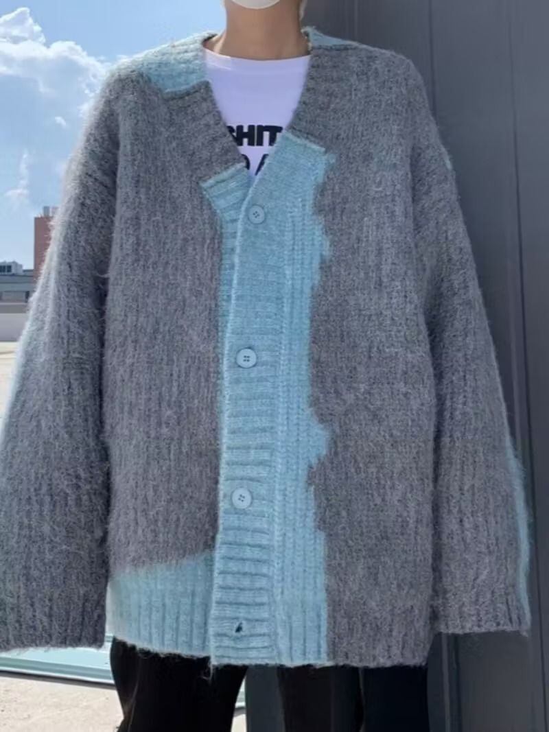 メンズ カーディガン セーター Vネック ソフトニット カラーブロック グレー ルーズフィット カジュアル レトロ アメリカン ストリート スタイル 暖かい 秋冬 コート おしゃれ デイリー アウター 冬用