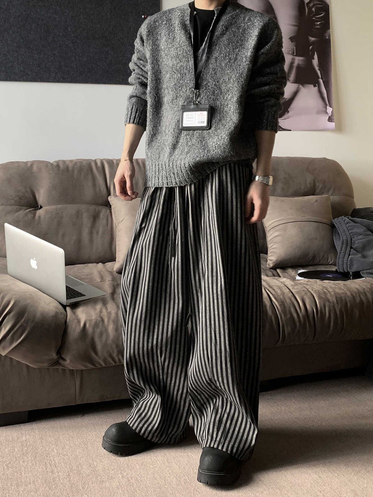 メンズ ワイドレッグパンツ ストライプ レトロ カジュアル ドレープ ストレート シルエット プレミアム 生地 ゆったり リラックス ボトムス おしゃれ トレンド 通勤 通学 春夏 秋冬 コーデ 快適