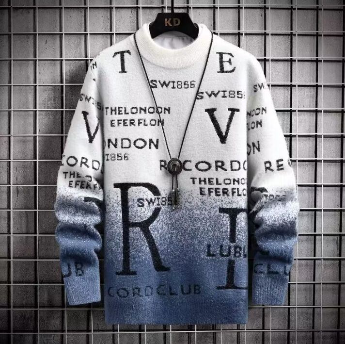 メンズ フリース風セーター ブラックオンブレ 英字プリント ルーズフィット 冬用 暖かい プルオーバー