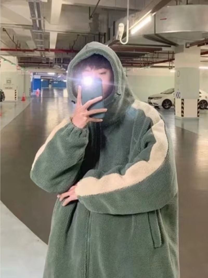 メンズ フリース ジャケット フード付き 韓国 ストリート オーバーサイズ 冬用 コート グレー グリーン カーキ ルーズフィット カジュアル フルジップ 学生 若者 アウター