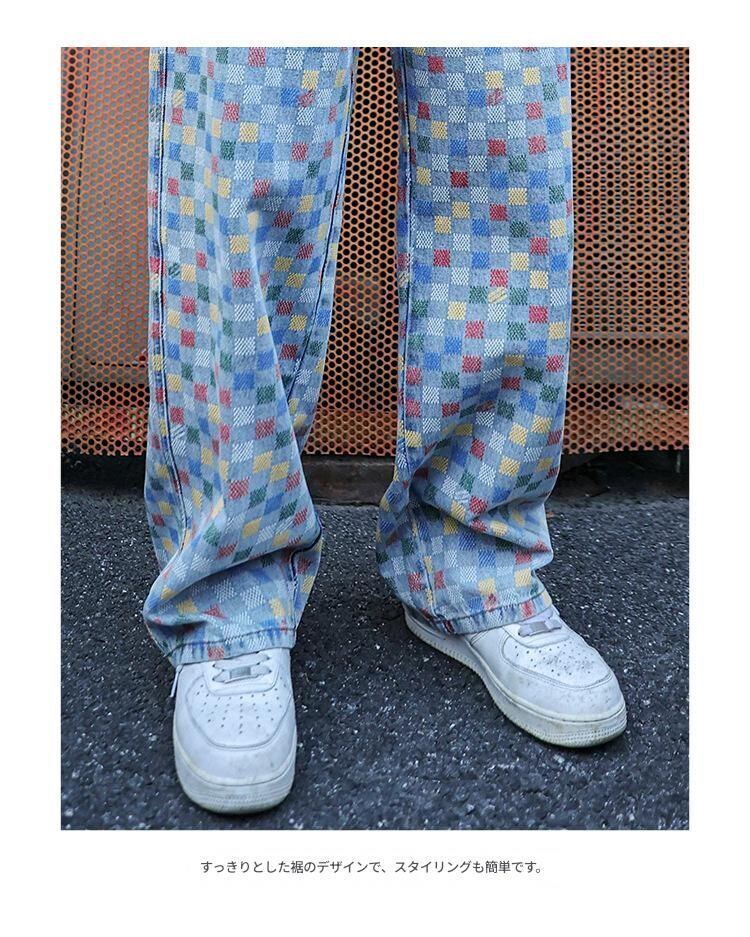 アメリカンカジュアル ヘビーウェイト チェック柄 デニムジーンズ ルーズフィット ストレートレッグ ハイストリート ワイドレッグ オールシーズン対応 メンズパンツ 微ストレッチ