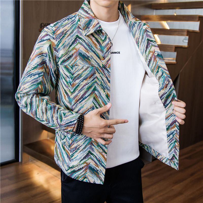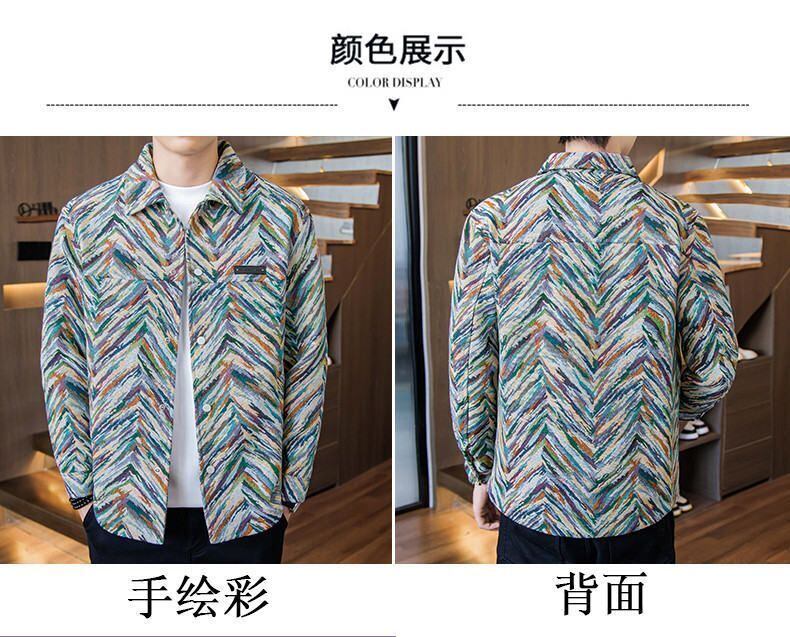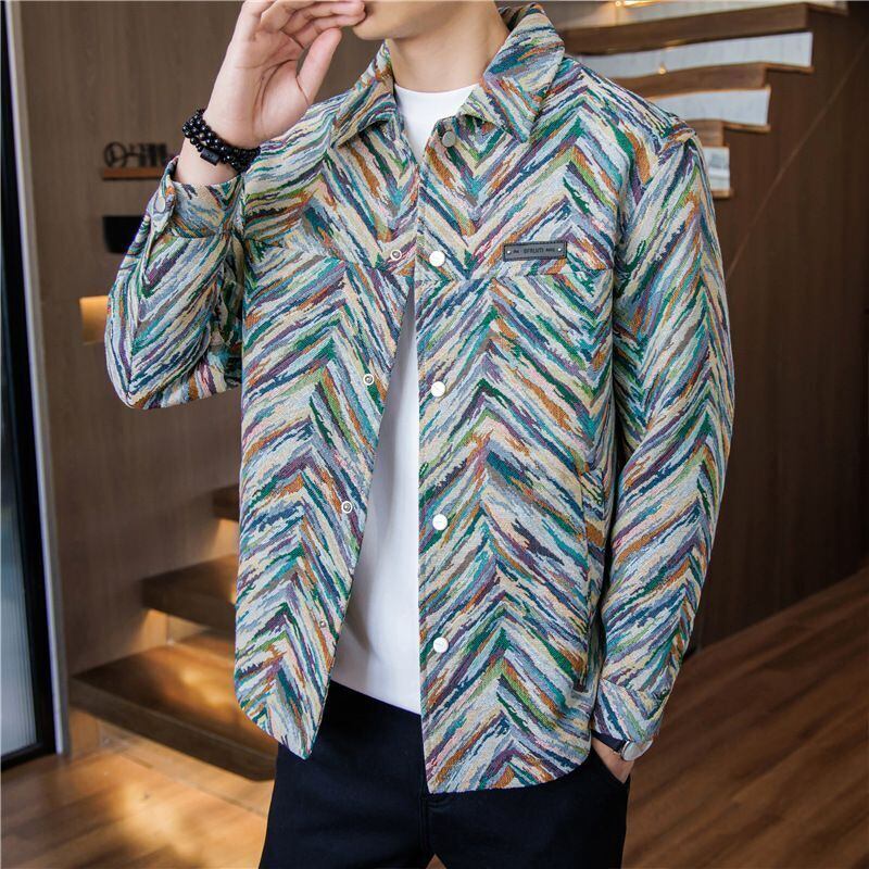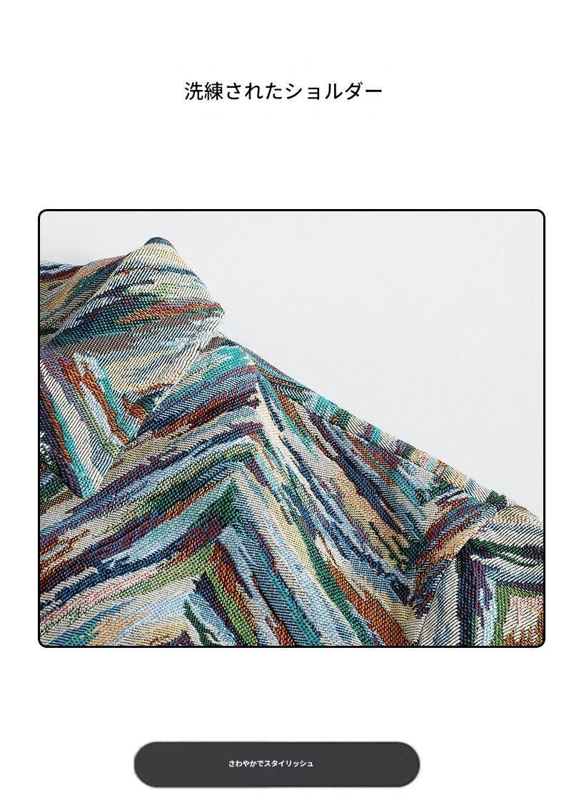 カラフルなジャカード柄が映える「【メンズ】スタイリッシュ カラフル ジャカード ワークウェア ジャケット ラペルカラー スナップボタン ポケット付き レギュラーフィット カジュアル&スポーティ対応 メンズアウター」をご覧ください。このジャケットは、機能性抜群でありながら、スポーティでスタイリッシュなデザインが特徴です。ラペルカラーやスナップボタンのディテールがアクセントとなり、様々なシーンでおしゃれに着こなすことができます。ポケット付きで実用性も高く、カジュアルからスポーティなスタイルまで幅広く対応するアイテムです。この機会にぜひ手に入れて、自分だけのスタイルを楽しんでみてはいかがでしょうか!