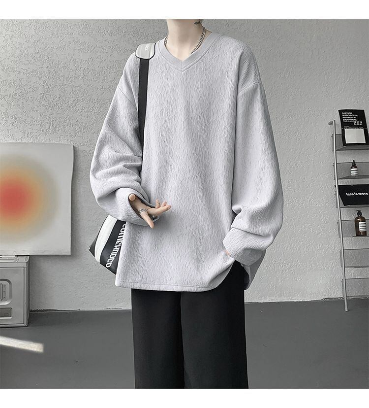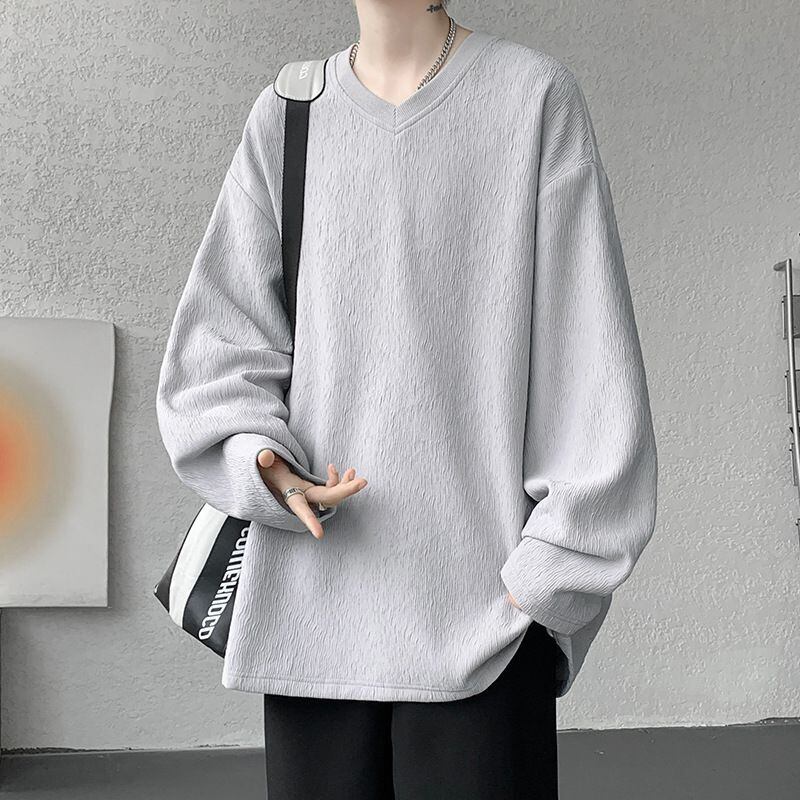 【メンズ】無地 テクスチャード ハートネック ゆったり 長袖 Tシャツ クルーネック ジャージー生地 カジュアル ベーストップ 着回し万能