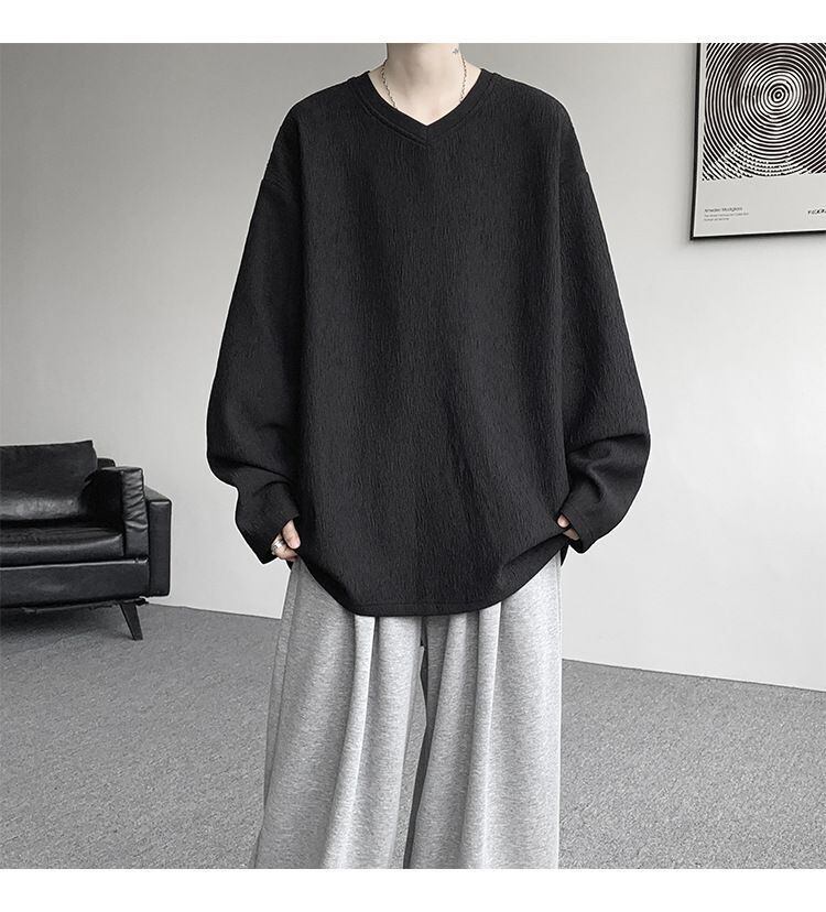 【メンズ】無地 テクスチャード ハートネック ゆったり 長袖 Tシャツ クルーネック ジャージー生地 カジュアル ベーストップ 着回し万能