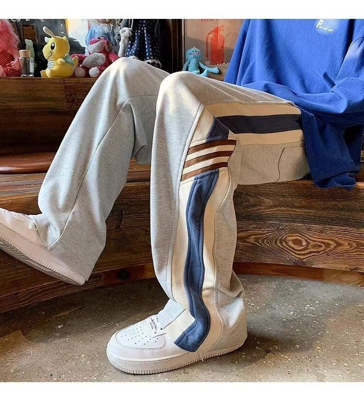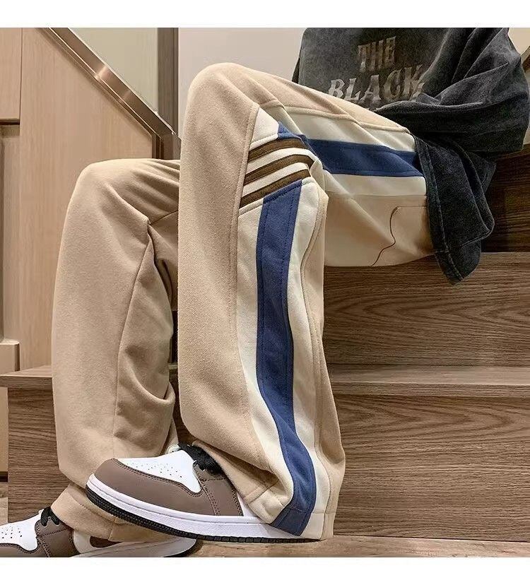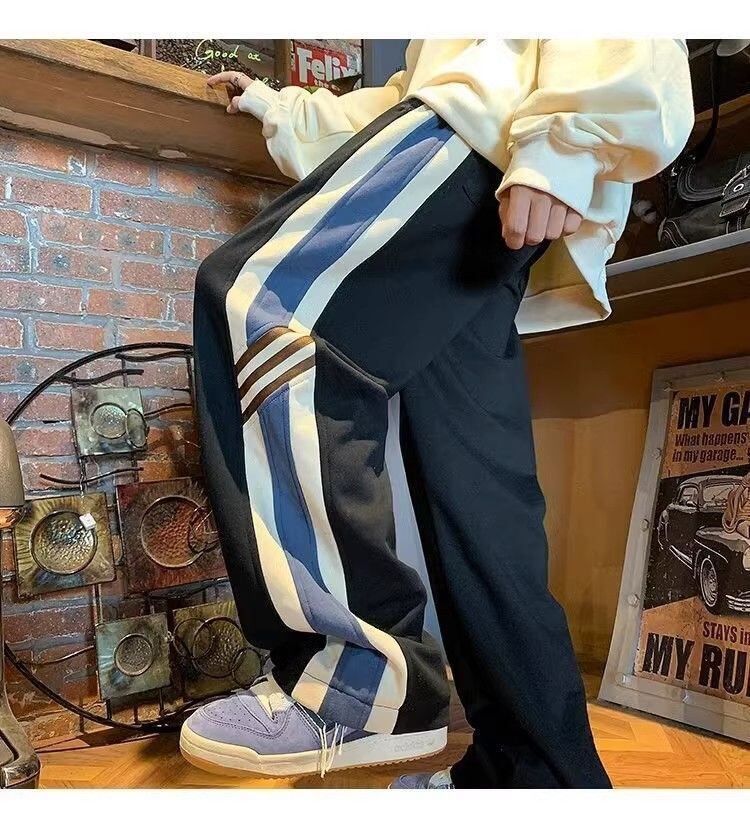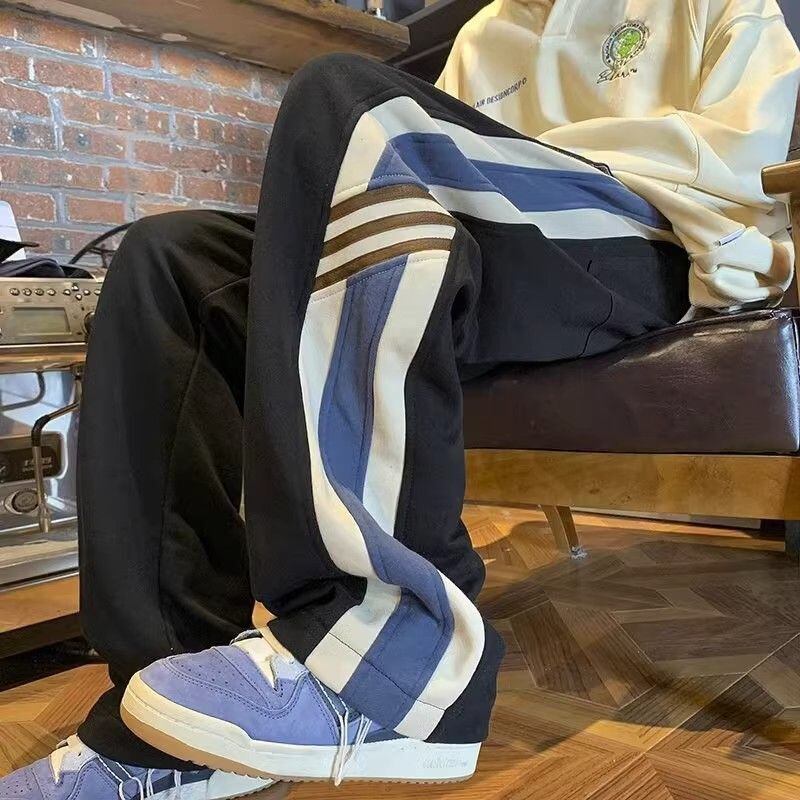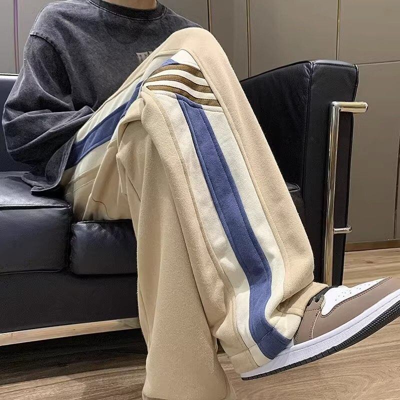 高品質 ストライプ カラーブロック パッチワーク パンツ メンズ 秋冬 ワイドレッグ ゆったり カジュアル スポーツ スウェット トレンディ ストレート ロングパンツ 若者向け