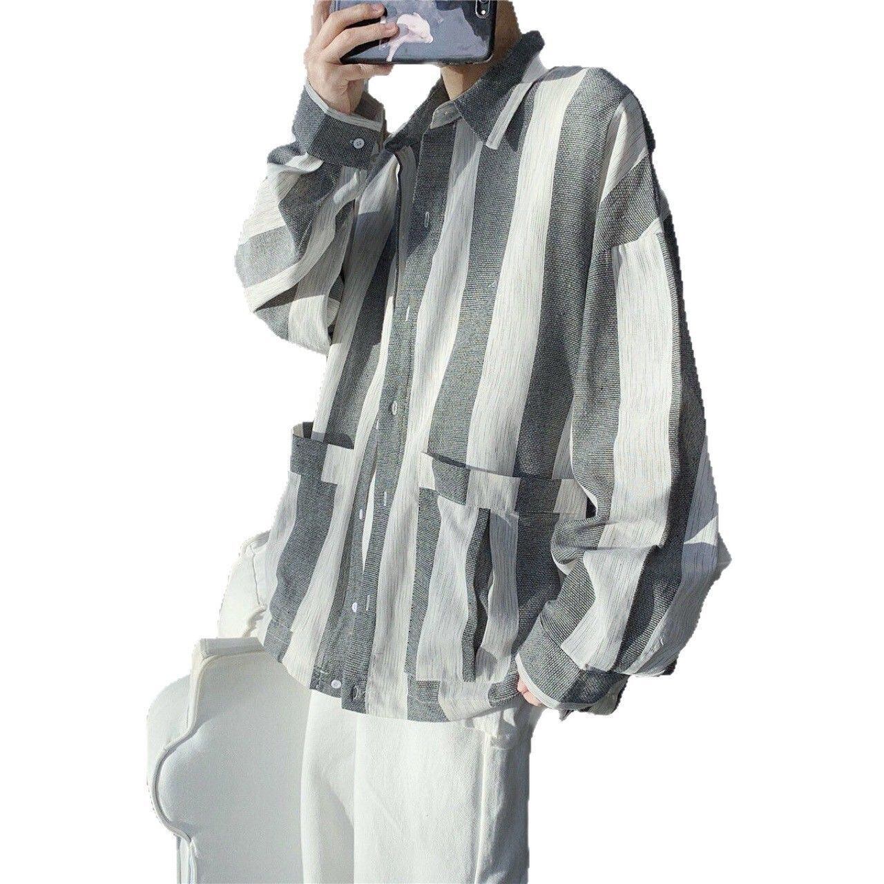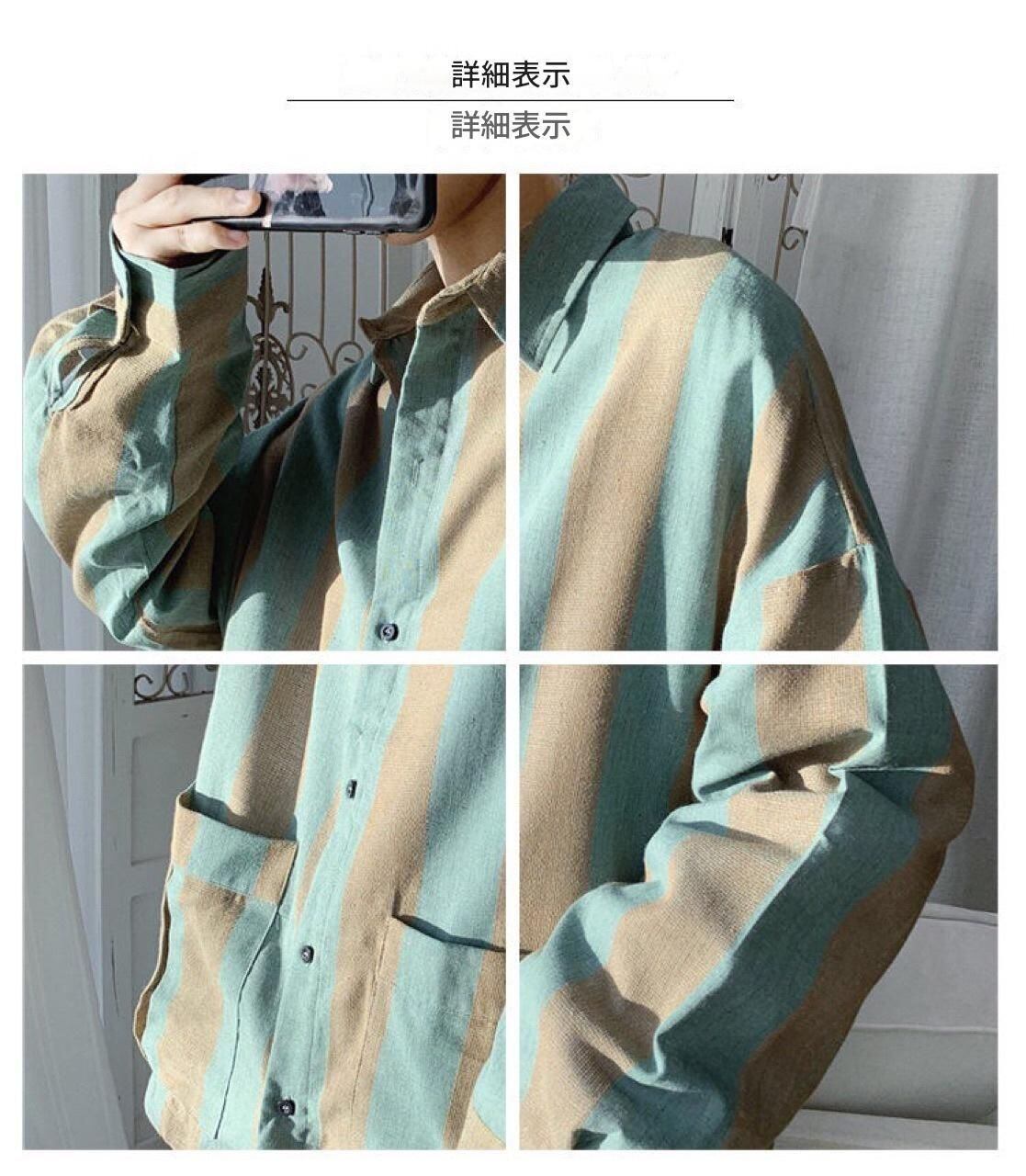 男性用 日本風 ストライプ シャツ 韓国風 ワークウェア カジュアル トップス 春秋 新作 長袖 ルーズフィット カップル&ティーン向け