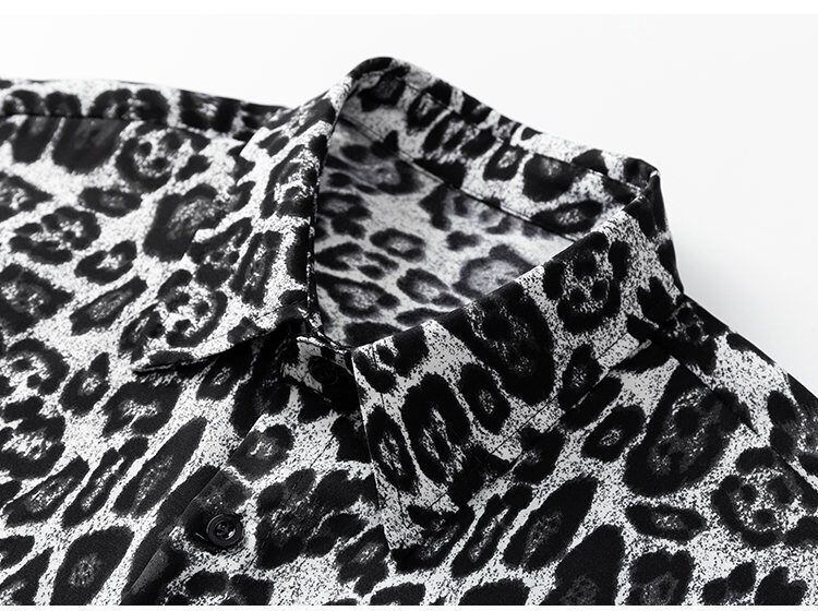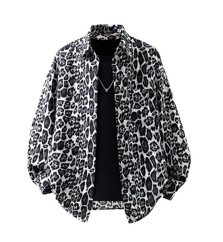 アメリカンレトロ メンズ ブラック&ホワイト レオパードプリント シャツ ルーズフィット ターンカラー ユニセックス カップル対応 春秋用 軽量 シャツジャケット プラスサイズ対応
