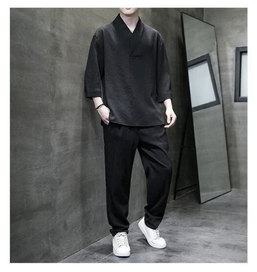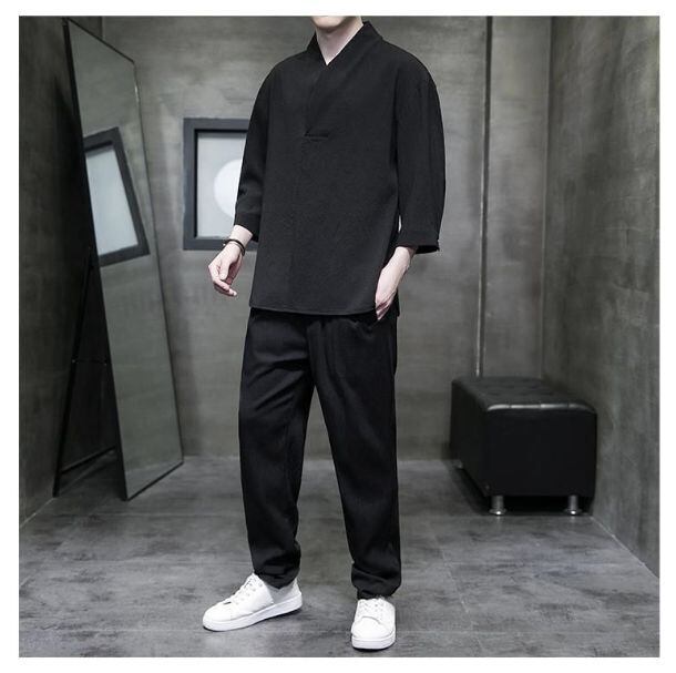 2025年新作 メンズ 夏用 薄手 カジュアル スポーツスーツ 中国風 ハイエンド Vネック スリムフィット 三分袖 ツーピース セットアップ