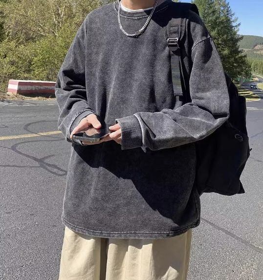 アメリカンヴィンテージ ウォッシュド 長袖 無地 Tシャツ メンズ ラウンドネック 純綿 コットン インナー 春秋用 ベーシック カジュアルトップス