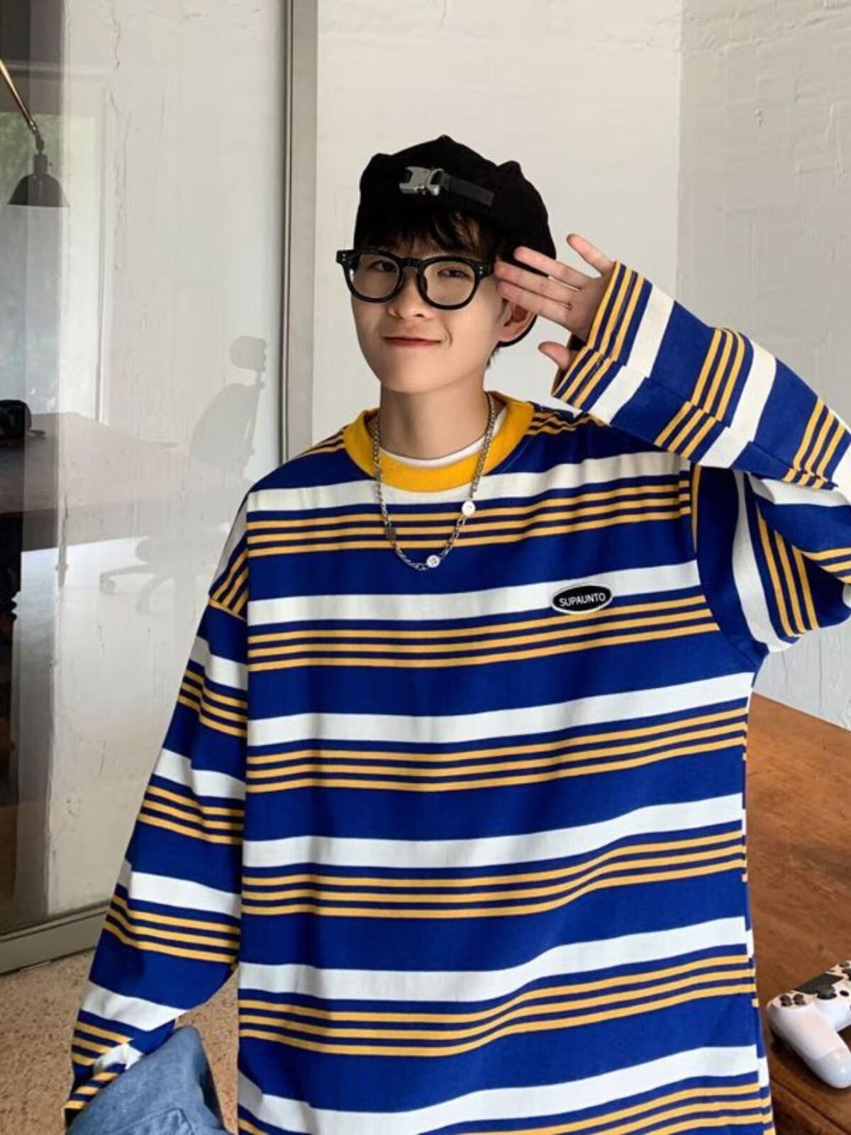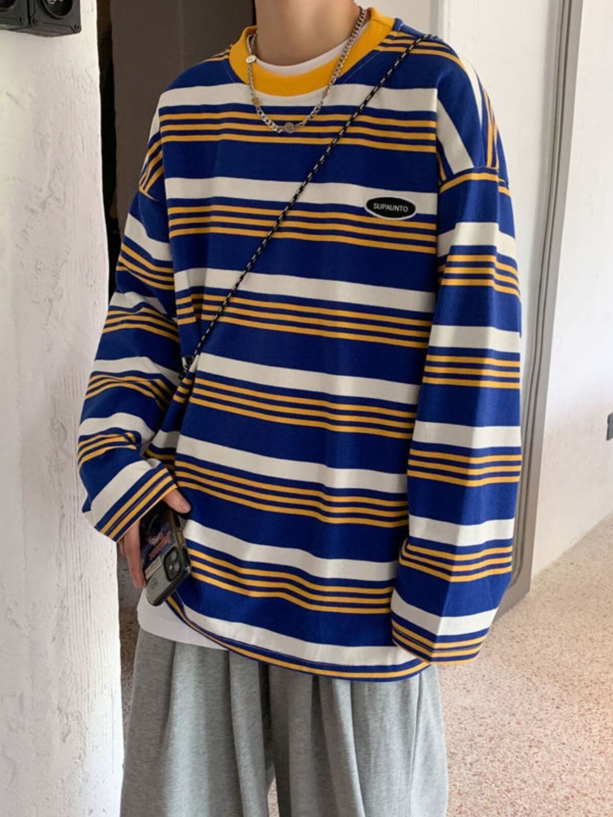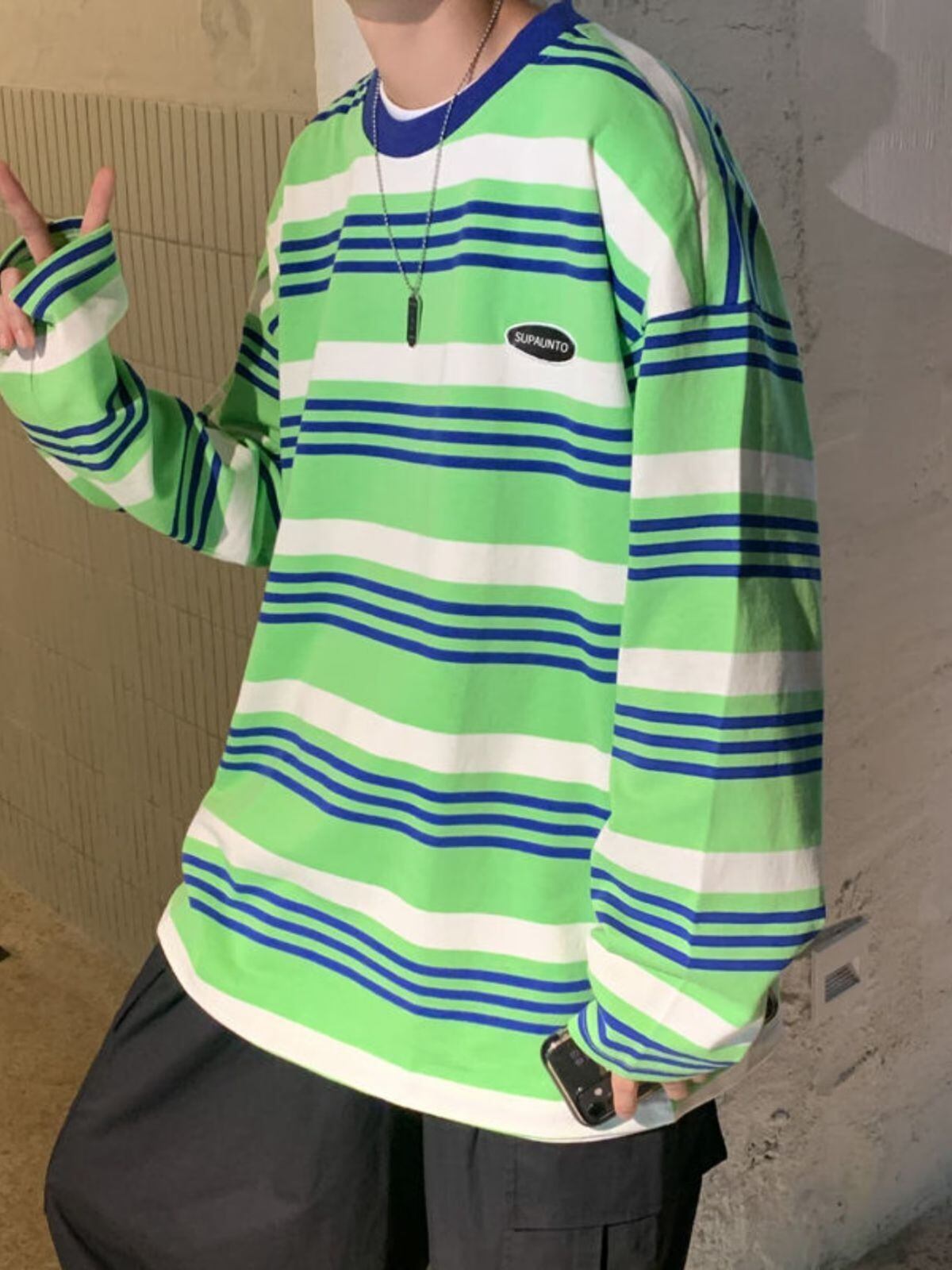 メンズ Tシャツ 長袖 ロンT クルーネック ストライプ ボーダー グリーン ブルー ストリート カジュアル 韓国ファッション ルーズフィット オーバーサイズ ビッグシルエット レイヤード 春 秋 オールシーズン 通気性 トレンド おしゃれ ユニセックス
