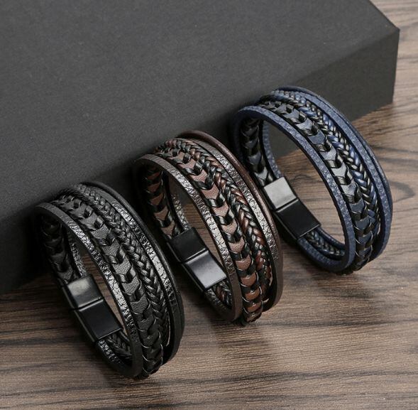 【メンズ】多層編み込み PUレザー ブレスレット 合金マグネット留め クロスボーダー 人気アクセサリー カジュアル ギフト