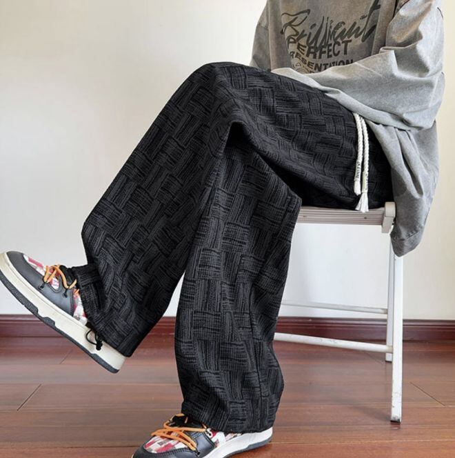 メンズ チェック ワイドレッグパンツ 幾何学柄 ドローストリングウエスト 日本ストリート ルーズストレート カジュアルトラウザー