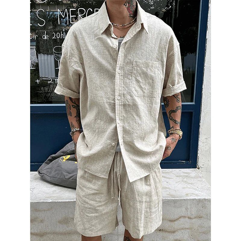 メンズ テクスチャード 半袖シャツ&ショートパンツ セットアップ ラペルカラー ルーズフィット 無地 カジュアル 春夏秋対応