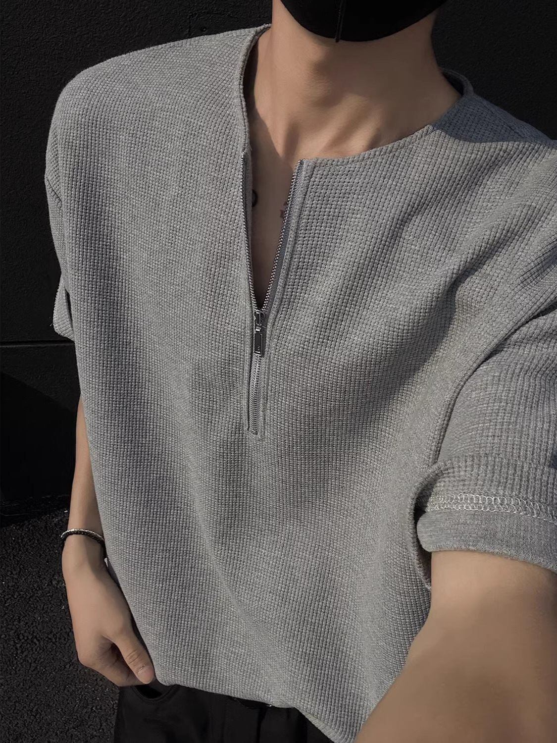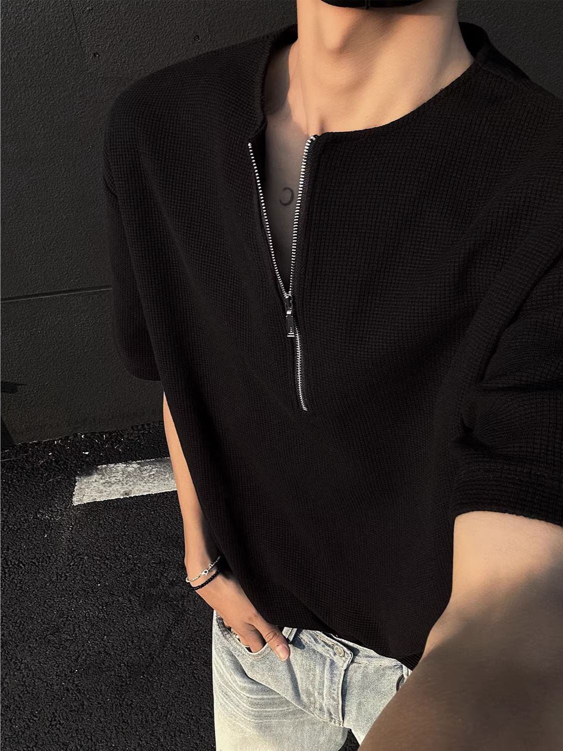 メンズ ワッフル 半袖Tシャツ ハーフジップ ルーズフィット 夏用 軽量 通気性 クリーンフィット カジュアルトップス