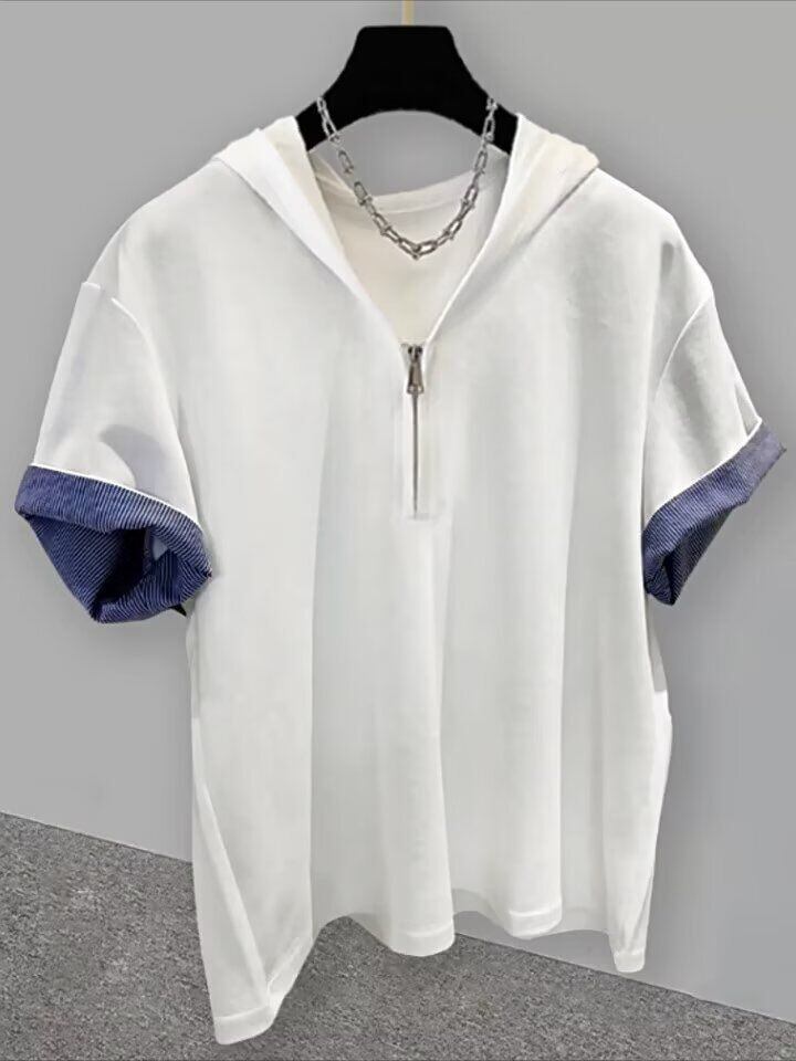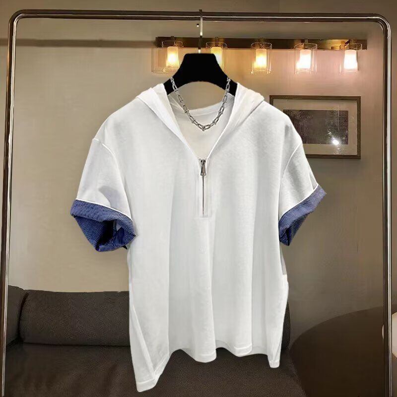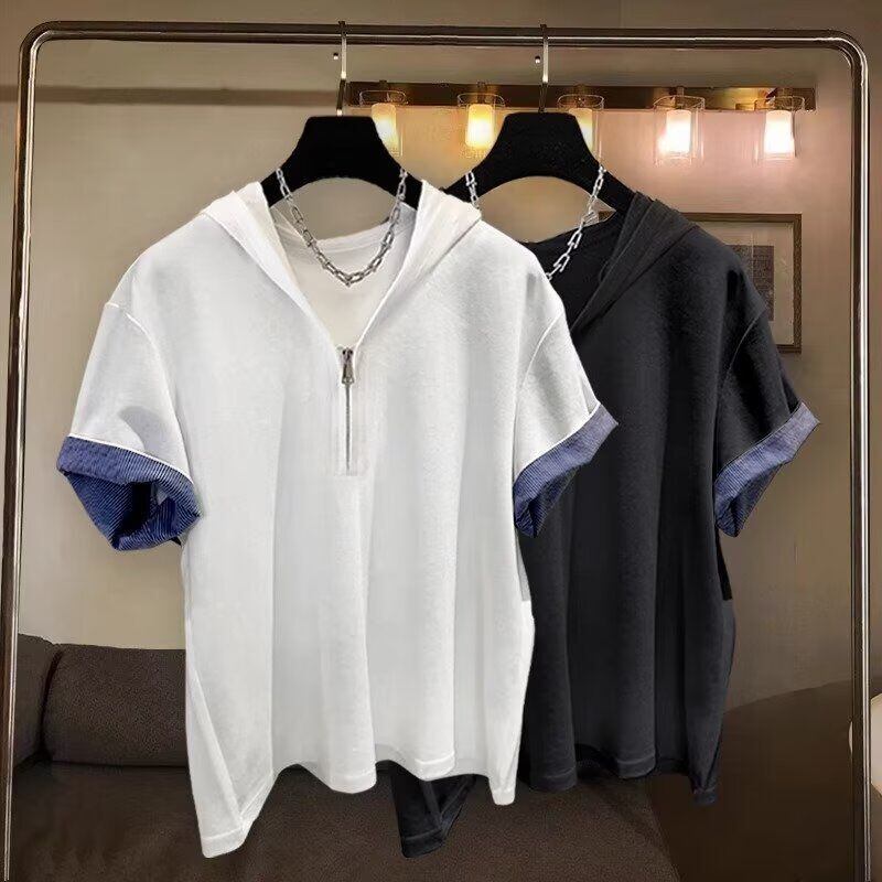 メンズ 冷感 半袖Tシャツ ハーフジップ フード付き バットウィング ルーズフィット 通気性 夏用 無地 カジュアルトップス