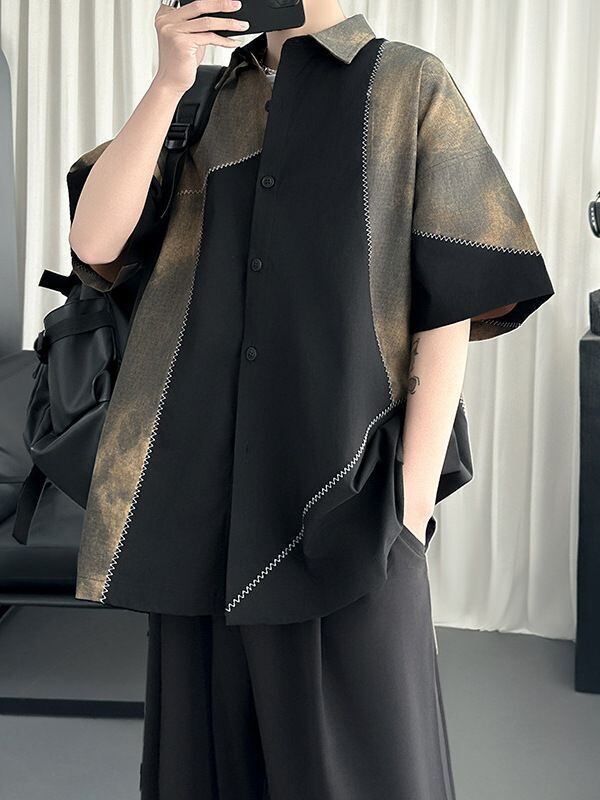 メンズ 和風 パッチワーク 半袖シャツ ヴィンテージ襟 カラーブロック ルーズフィット 夏用 カジュアルトップス