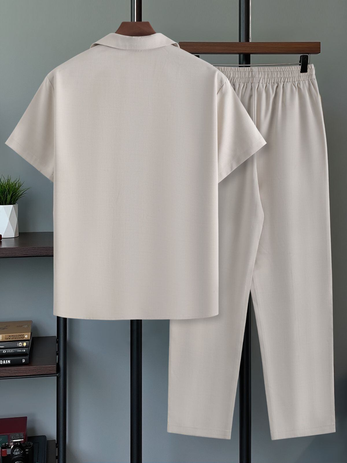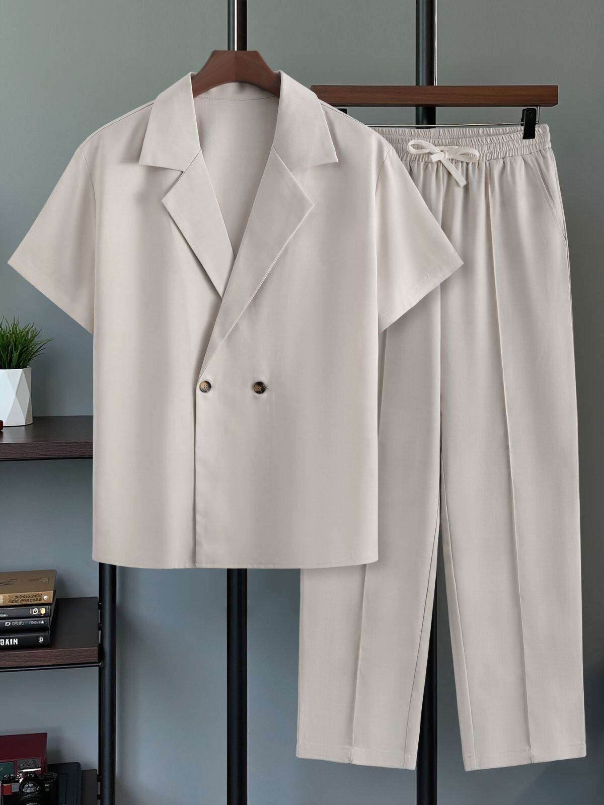 メンズ セットアップ 半袖シャツ&ルーズパンツ ダブルブレスト スーツ襟 巾着ウエスト 2点セット カジュアル オールシーズン