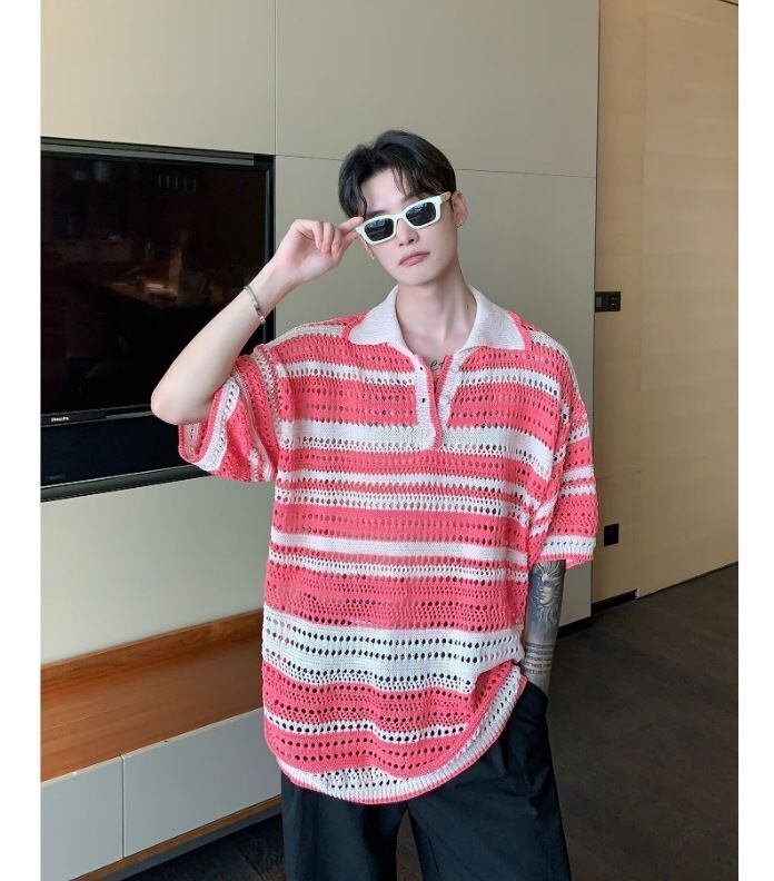 「ユニセックス ストライプ 半袖ポロシャツ 透かし編み ニット ルーズフィット 韓国 原宿 ストリート 通気性 春夏トップス」をご覧ください!このポロシャツは、透かし編みとストライプ柄が絶妙に組み合わさったデザインで、視線を惹きつけるアイテムです。柔らかいニット素材を使用しており、ルーズフィットなシルエットがリラックスした着心地を提供します。春夏の季節にぴったりな通気性に優れた作りなので、快適にお過ごしいただけます。韓国や原宿のストリートスタイルを楽しむ方にもうってつけの一着です。この機会にぜひお試しください!