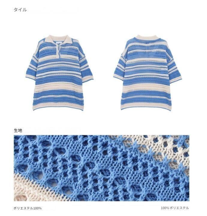 ユニセックス ストライプ 半袖ポロシャツ 透かし編み ニット ルーズフィット 韓国 原宿 ストリート 通気性 春夏トップス
