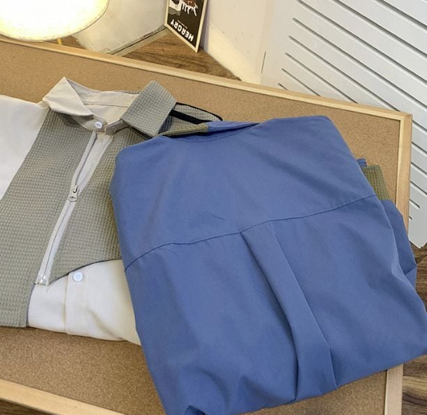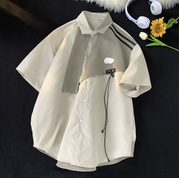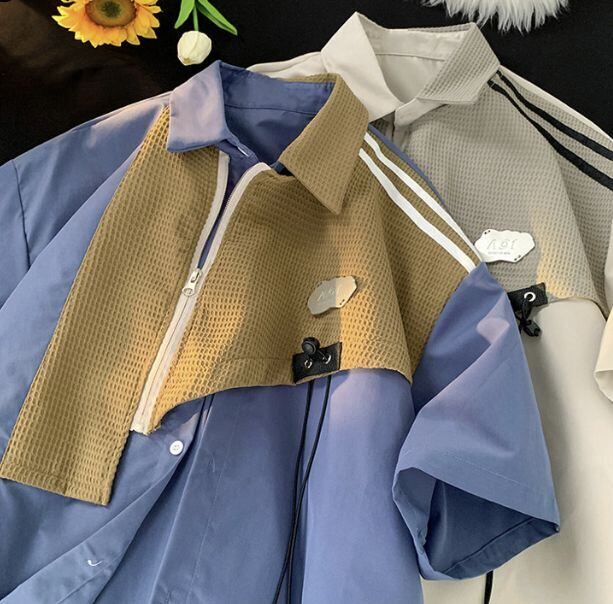 メンズ レトロ カラーブロック 半袖シャツ パッチワーク ルーズフィット ストリート カジュアル 夏用トップス
