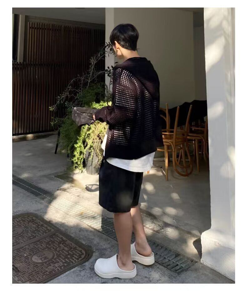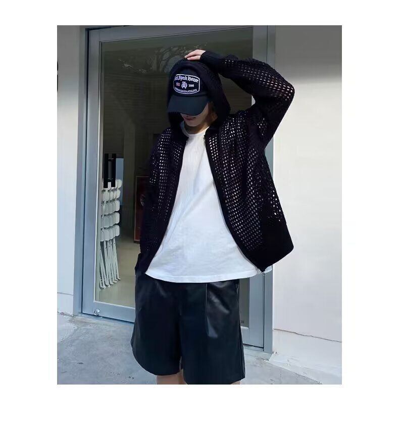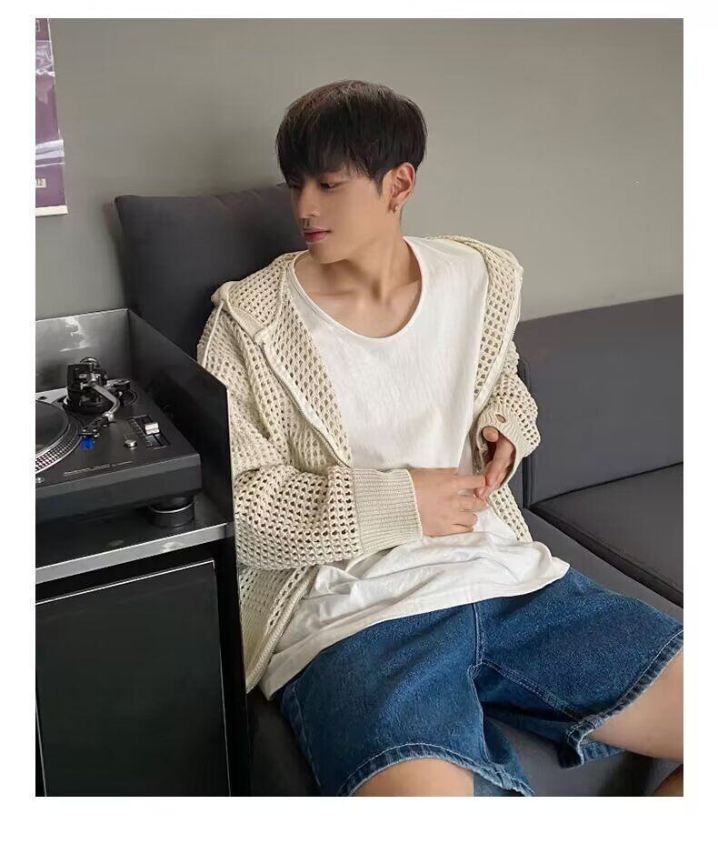 メンズ サマーパーカー 薄手 メッシュ カーディガン フード付き 透かし編み オーバーサイズ ルーズフィット プラスサイズ 夏用トップス