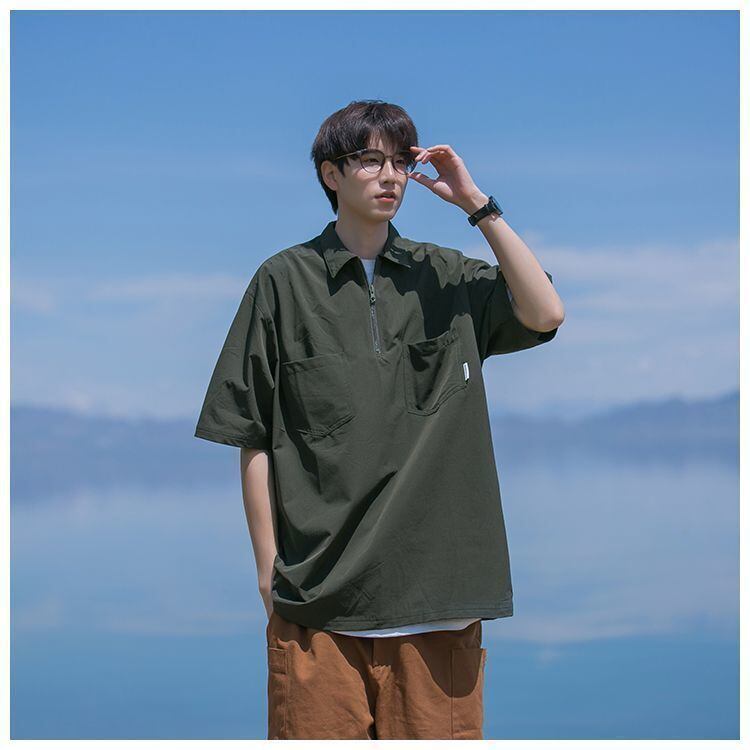 メンズ サマー ハーフジップ 半袖シャツ 日本風 ワークウェア ターンカラー ルーズフィット カジュアル トレンドトップス 夏用